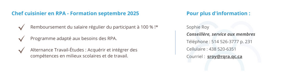 Développer et enrichir les compétences de votre cuisinier(ère), une opportunité à ne pas manquer! Le RQRA a développé une formation Chef Cuisinier en RPA entièrement subventionnée en collaboration avec l’école hôtelière Fierbourg, la Formation continue Chemin-du-Roy et l’appui financier du gouvernement du Québec. Deux régions : Capitale-Nationale et Mauricie-Centre-du-Québec.